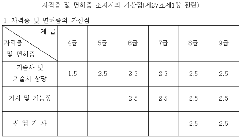 자격증 점수는 산업기사와 기사(기능장), 기술사에 대해 직급별로 최대 2.5점을 부여하고 있다.